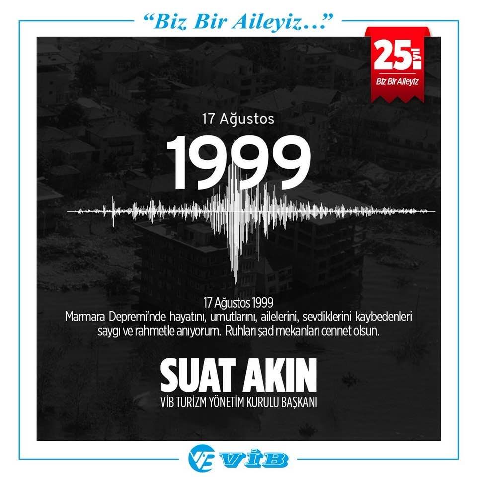 Sakarya VİB Turizm Yönetim Kurulu Başkanı Suat Akın, 17 Ağustos 1999 depreminin yıldönümü dolayısıyla bir mesaj yayınladı